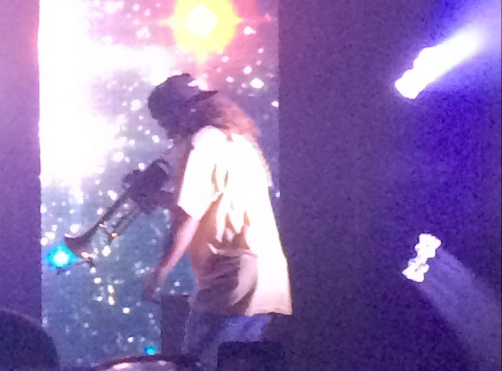 And it is just TS for the whole set as they use technology to make it feel like a whole band is up there on the stage. TS’s energy is amazing – bounding across the stage, leaping into the air several times in a sort of squished body-scissor action guitar in hand, blowing a trumpet. There are some great psychedelic back projections but even without them the show would have spectacle in abundance.
