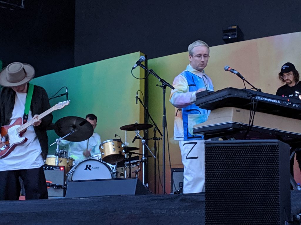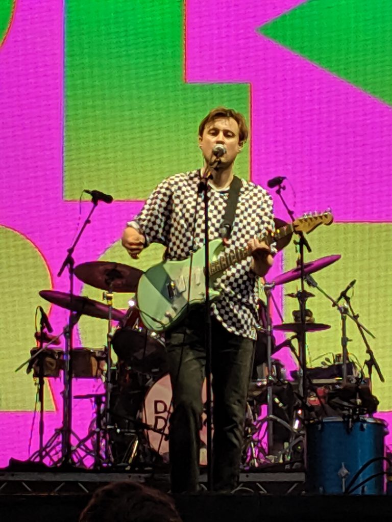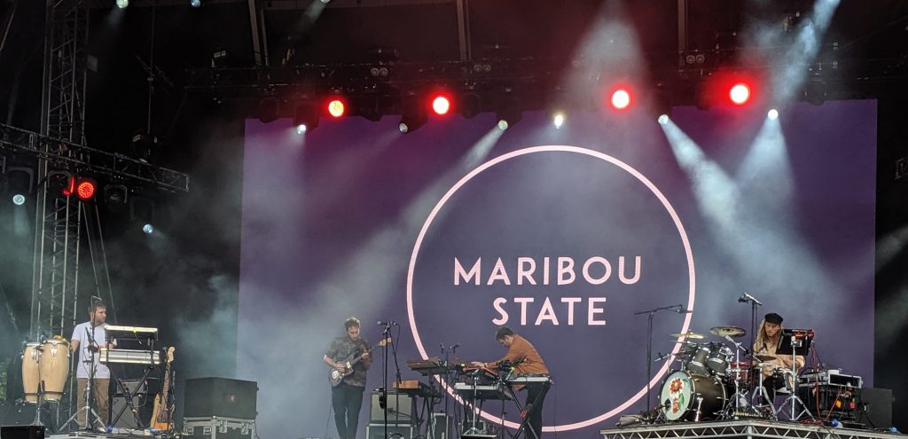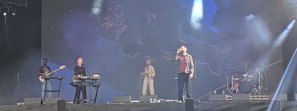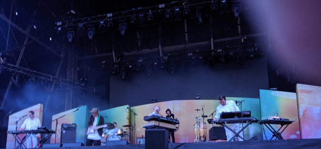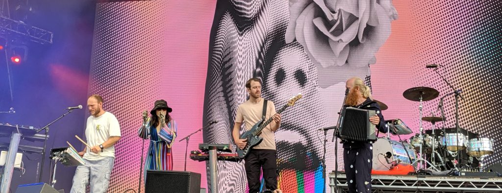 First band Lylo deserved larger crowdJohnny Lynch’s Pictish Trail warmed up crowd with friendly banter and his band’s enthusiastic setHonne are the first of the electro dance/pop bands that dominate the day – they are even better than when I saw them at St. Luke’s last yearMain men Andy and James are given great support by Mo on drums, Amadu on bass and BEKA on backing vocalsLittle Dragon are the highlight of the day’s supporting actsAs always, the charismatic Yukimi owns the stage – and in another eye catching outfitI had not seen Maribou State before and was very impressedThey are another electro duo who are bolstered live by an excellent touring bandAnd the wonderful Holly Walker joins them on stage to take lead vocals on several songsDjango Django in full flow – they go down a storm with crowdVincent Neff leads from the frontBut, as is only right and proper, the outstanding performance of the day comes from headliners Hot ChipUnassuming group wash day into night with barrage of electro dance killers (young boy dancer who melts heart of crowd just out of sight on left)